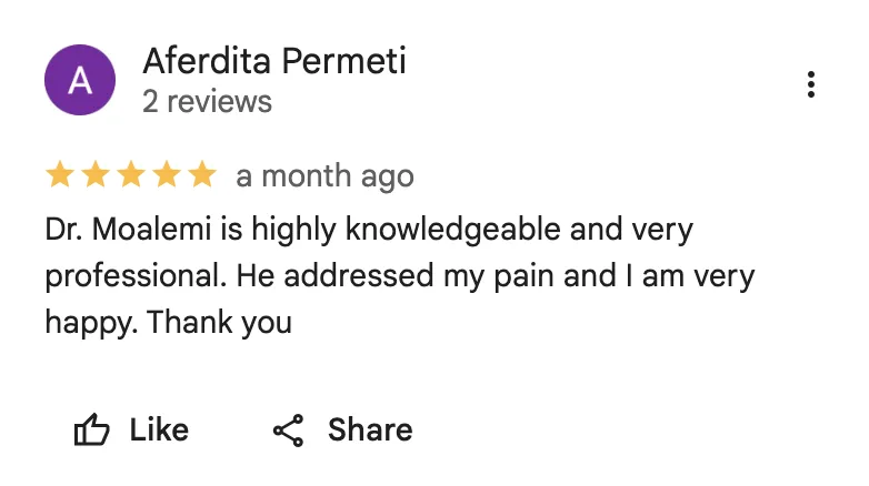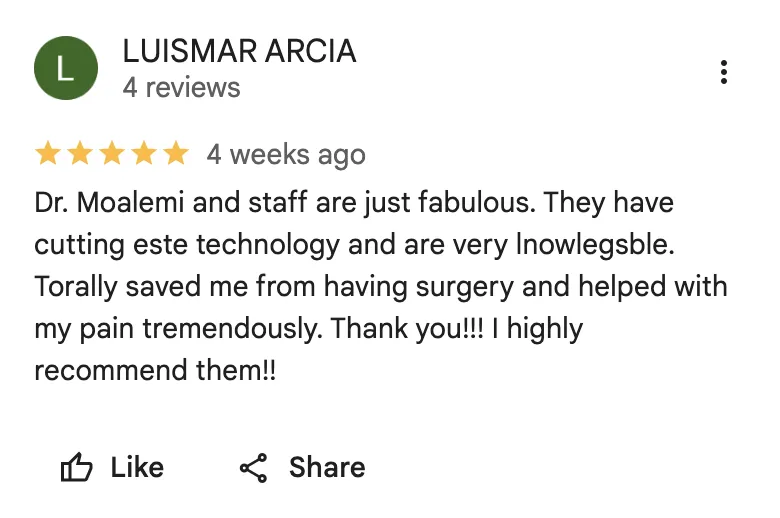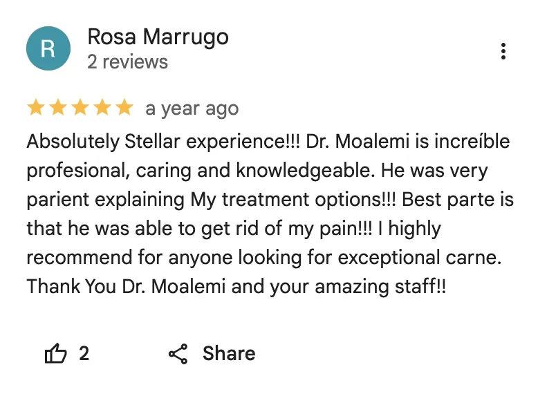 At our clinic, Dr. Moalemi and his team are dedicated to relieving pain and restoring function in a supportive and comfortable environment. We prioritize patient care by actively listening, customizing treatments, and focusing on lasting recovery — all with the goal of helping you return to a pain-free and active life.